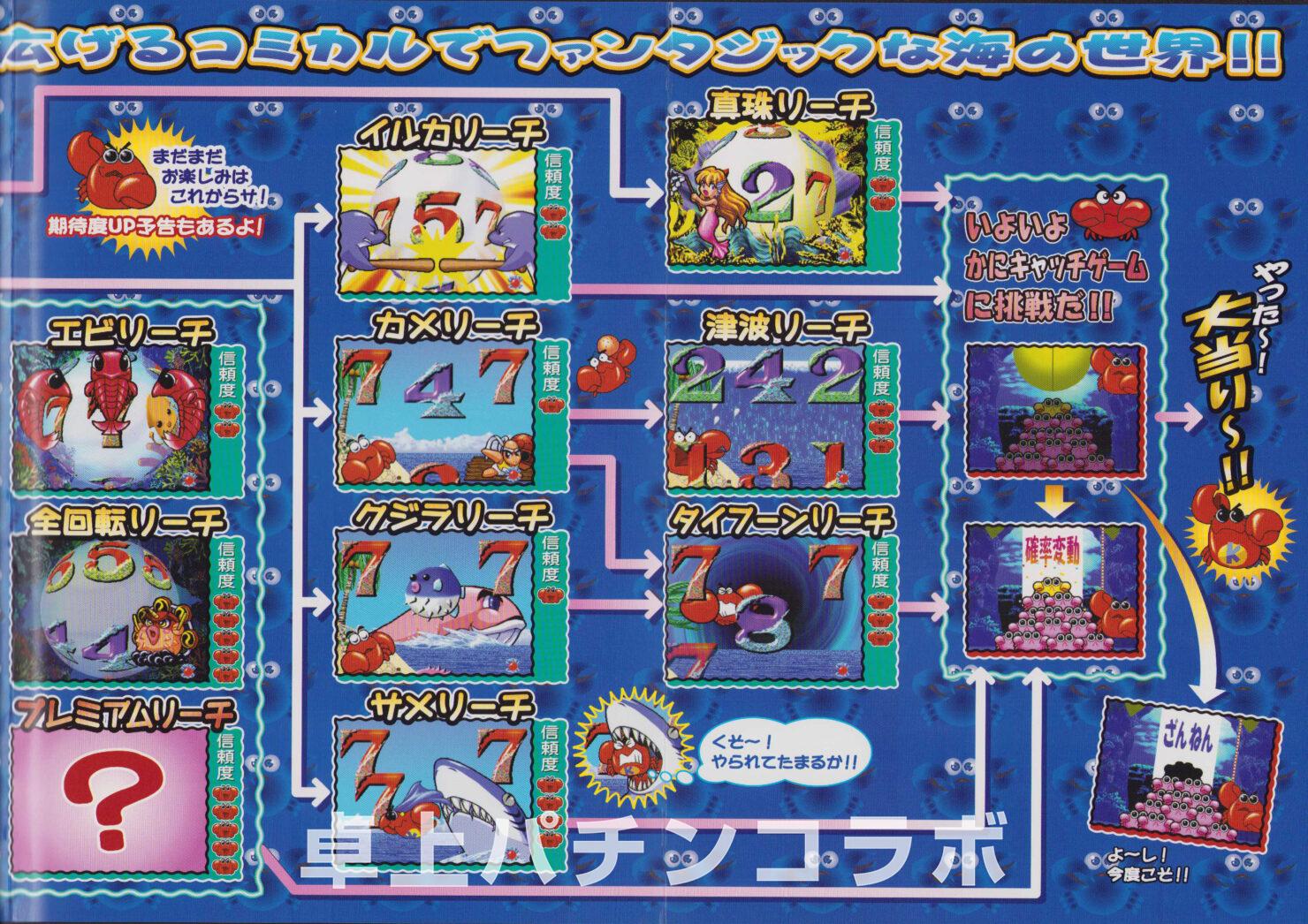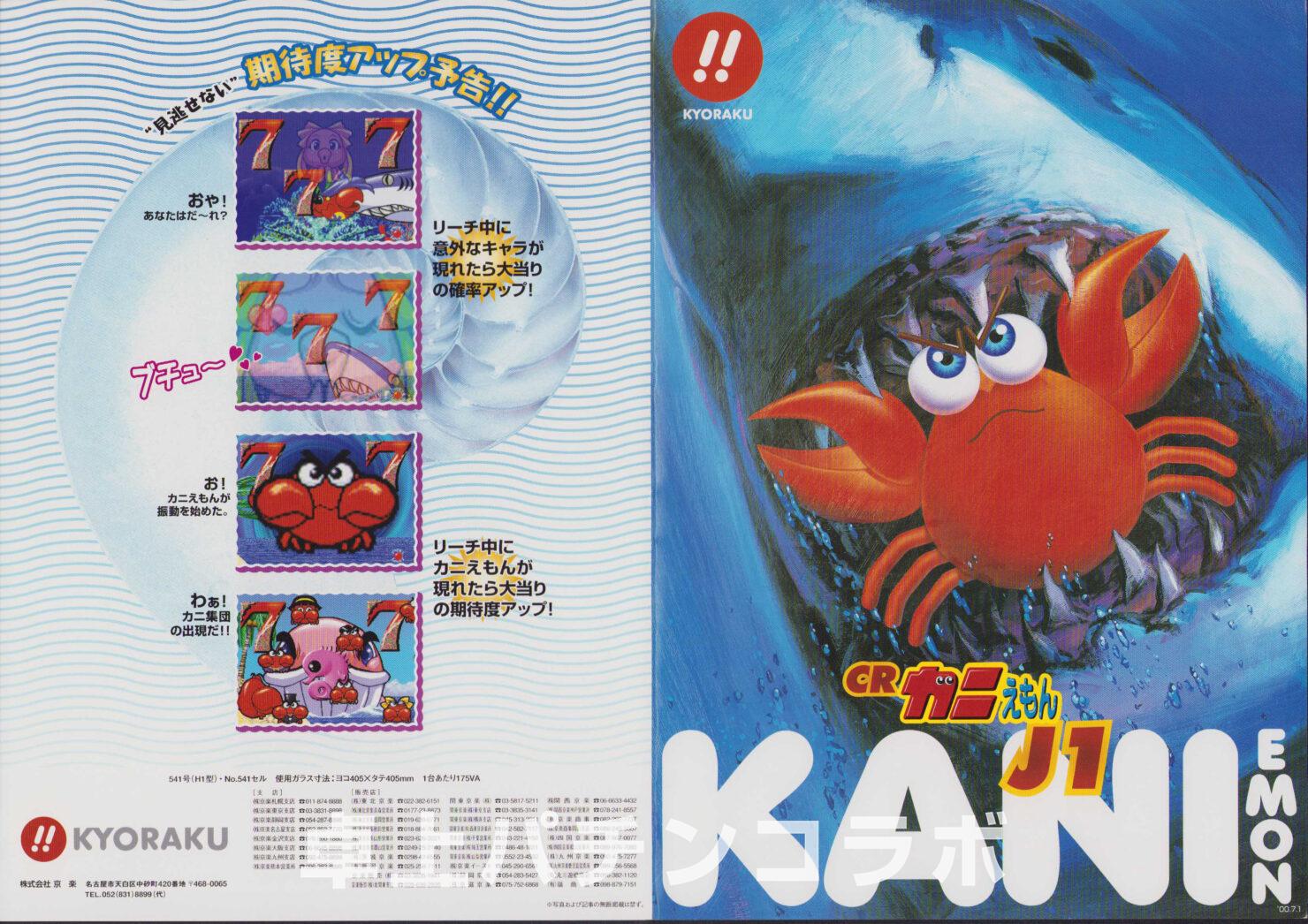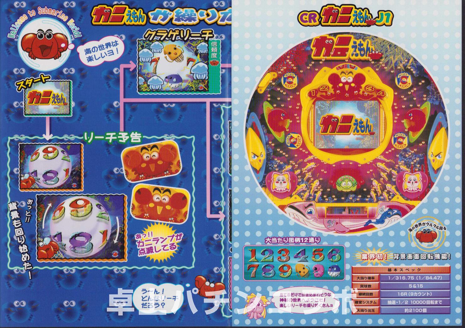 大当り確率1/316.75のCR機デジパチです。 (機種名CRカニえもんJ1 京楽、2000年) 大当り後の演出に成功すると 次回までの確率変動に突入&継続します。