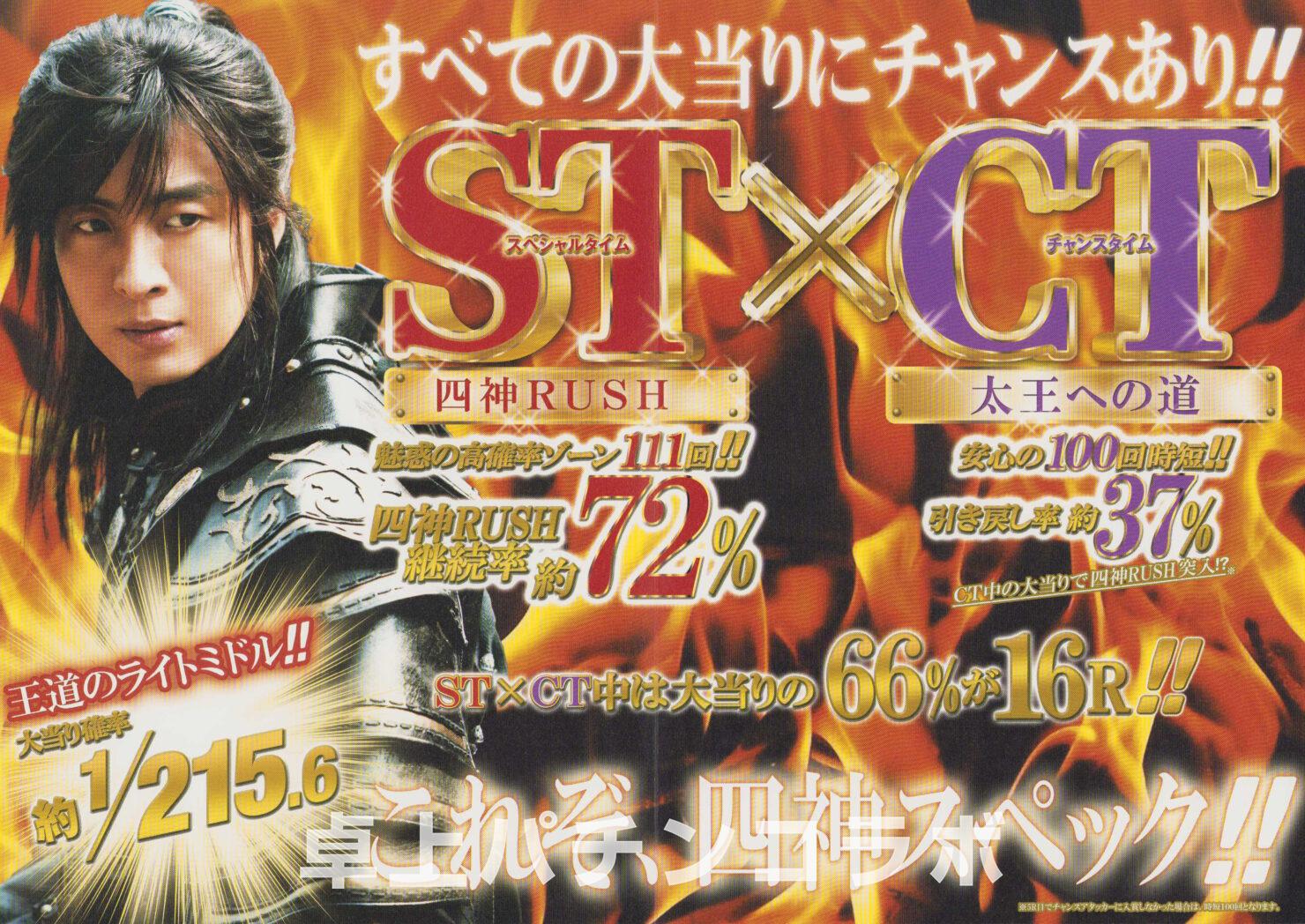 大当り確率1/215.6のCR機デジパチです。 (京楽、2012年) 大当り後に111回転の電サポ付きST確率と時短100回転に各50%の割合で突入します。