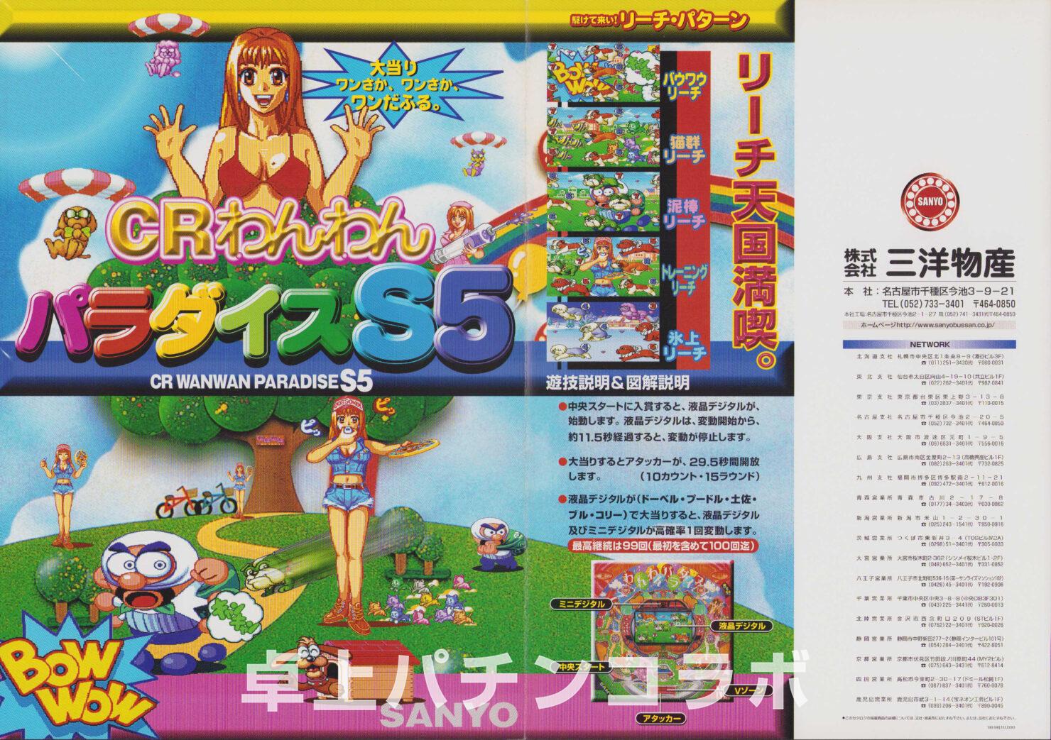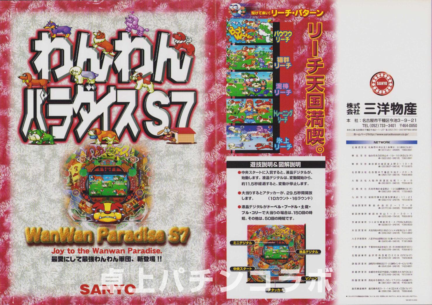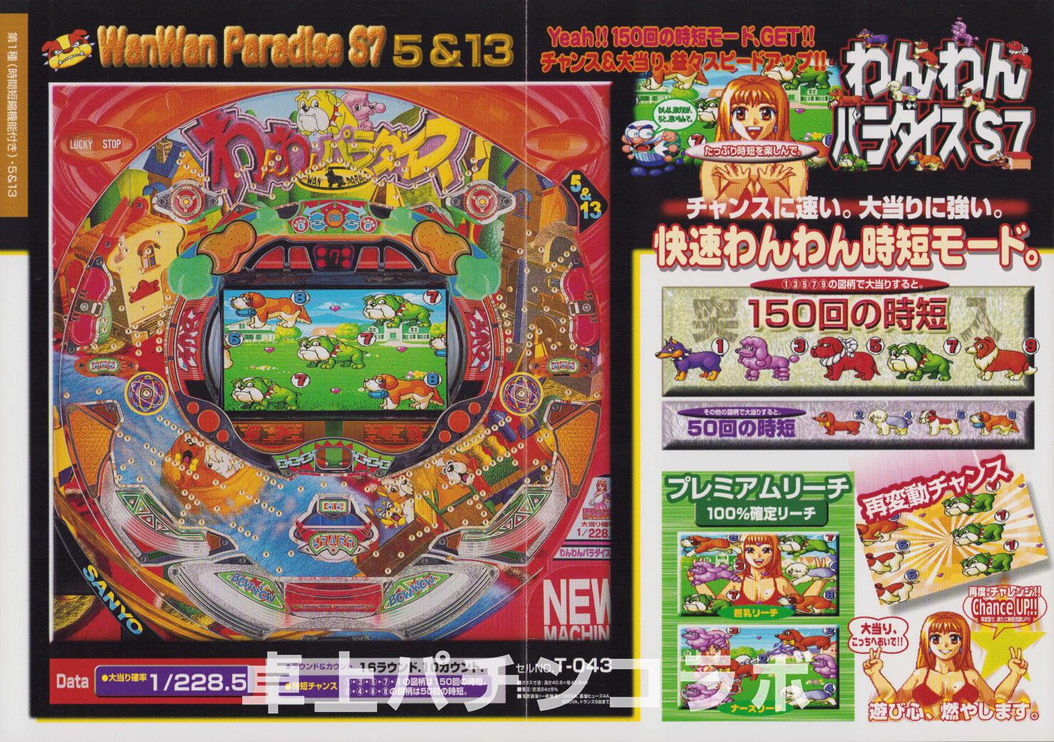 大当り確率1/299.5のCR機デジパチです。 (機種名CRわんわんパラダイスS5、三洋1999年) 1、3、5、7、9の絵柄で大当りすると 次回までの確率変動に突入&継続します。 わんわんパラダイスの初代機種になります。