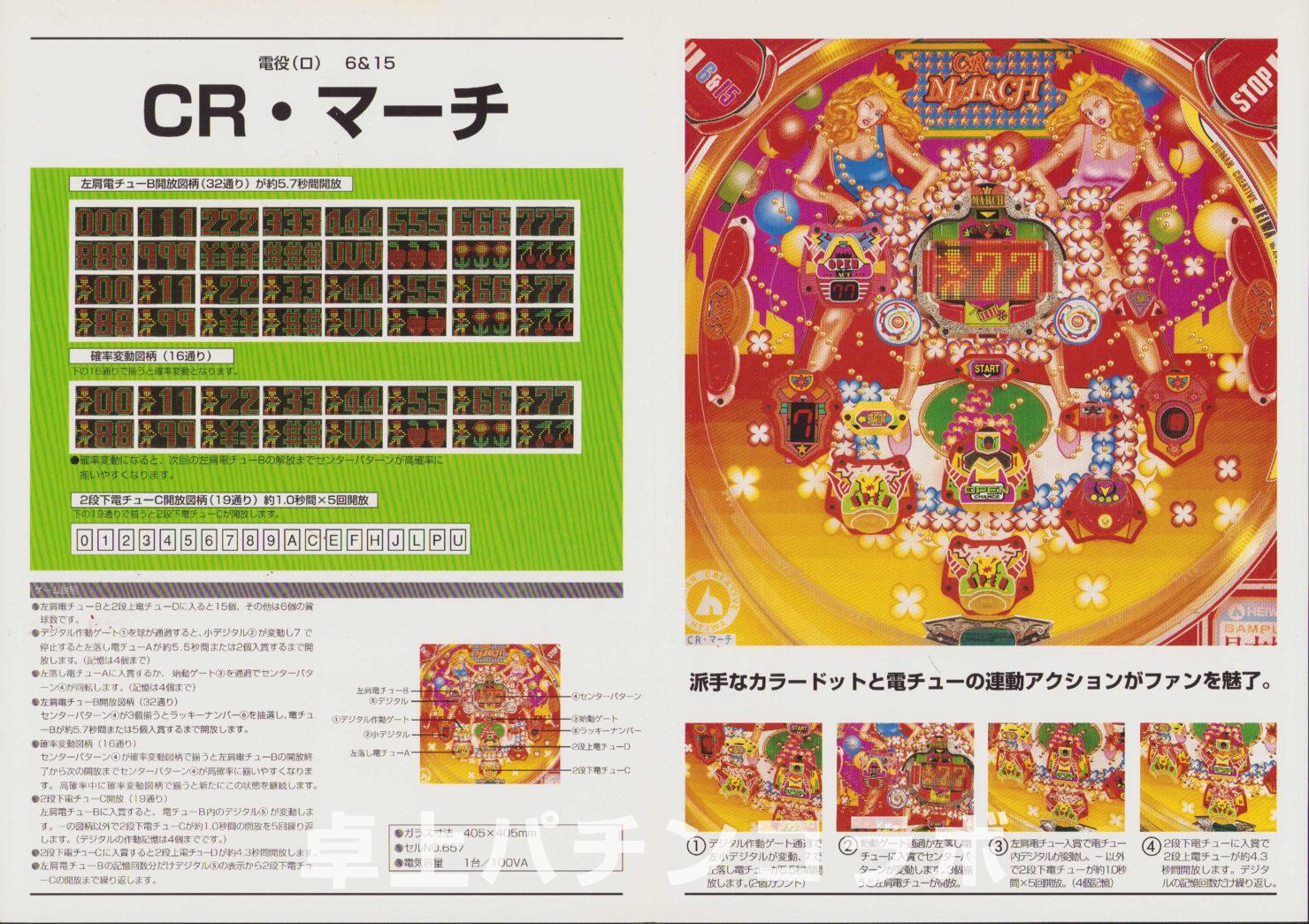 大当り確率1/229、1/251、1/271のCR一般電役機です。 大当り後にアタッカーが解放する代わりに電チューが連動して動きます。 絵柄3つ揃いで単発、左の人型のオールマイティー絵柄と絵柄2つ揃いで大当りすると、次回までの確率変動に突入&継続します。