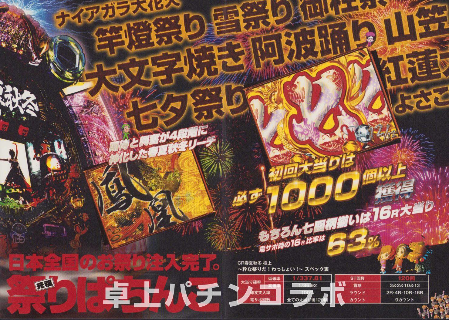 大当り確率1/219.92のCR機デジパチです。 (機種名CR春夏秋冬 極上~粋な祭りだ!せいやっ!~、 西陣2013年) 大当り後と突然確変当選で120回転限定の確率変動に 突入&継続します。